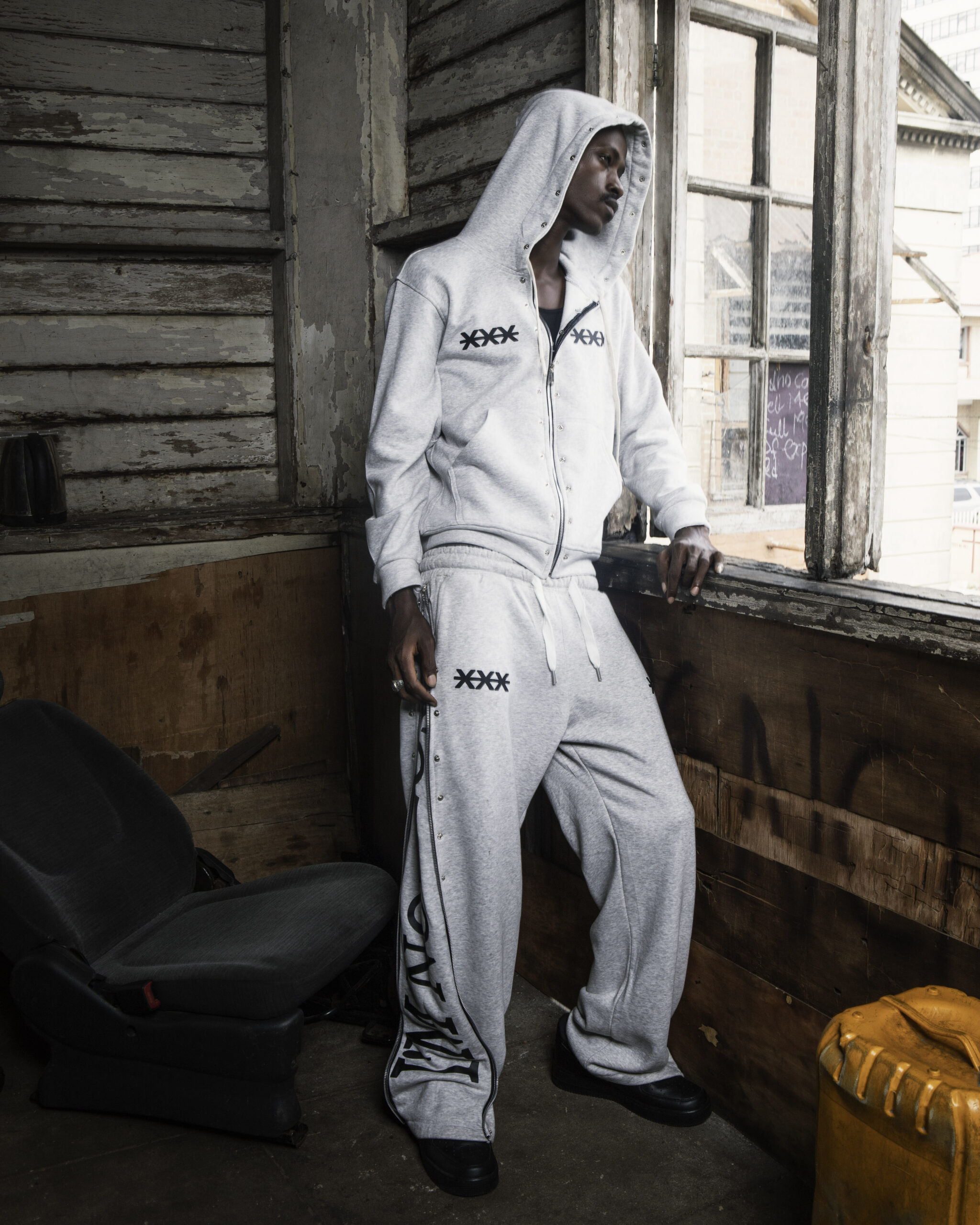 • Hoodie: XPLOREFW -XXX- chest logos, silver studs on zipper to hood, back “I’M NOT LOST” print