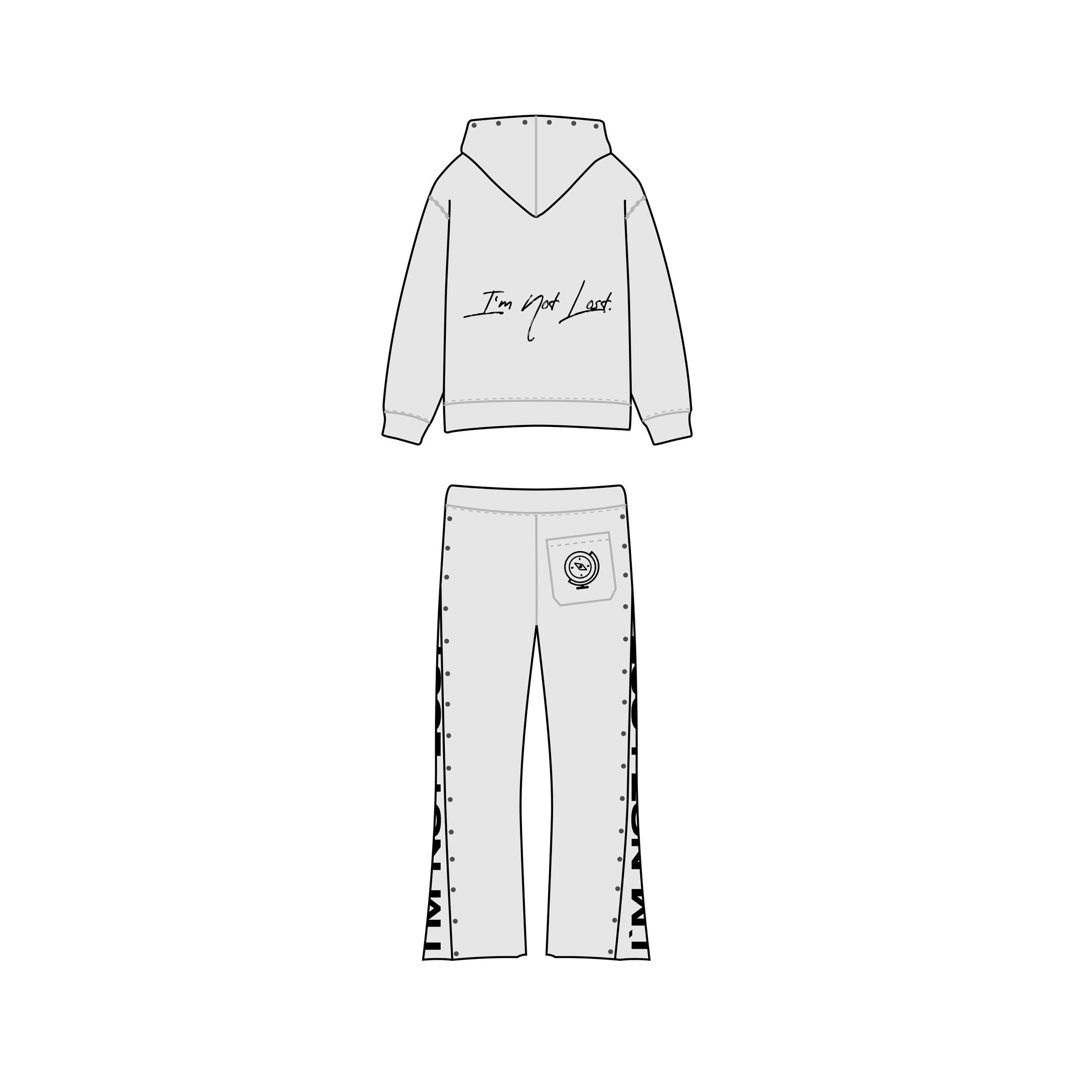 • Pants: Dual side zippers with flared reveal, hidden “I’M NOT LOST” print, full-length stud detailing